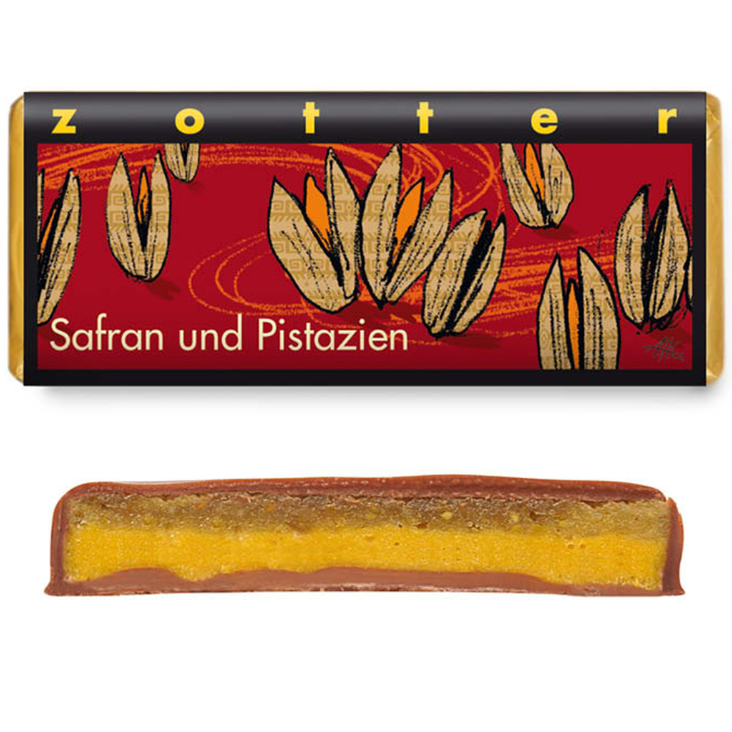 - Safran und Pistazien (Alk.). Milchschokolade gefüllt mit Pistazienmarzipan (30%) und Safranganache (28%) - alkoholhaltig