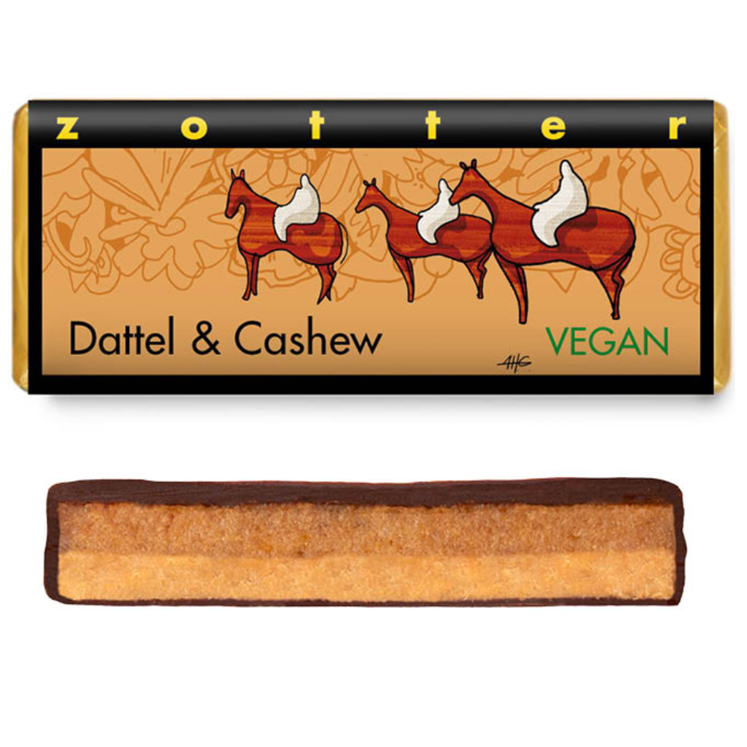 - Dattel + Cashew. Dunkle Kuvertüre mit 100 % Kakaoanteil gefüllt mit Datteln (33%) und Cashewnougat (18%)